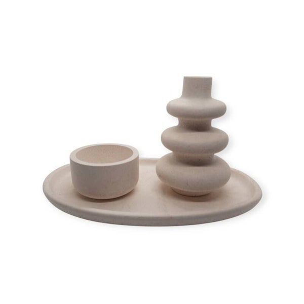 Decoratieve set van aquacast - plateau, vaasje en waxinelichthouder in beige