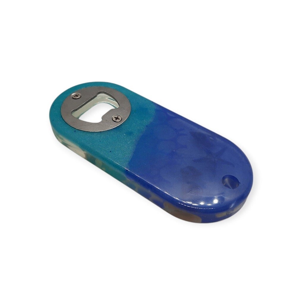 Handgemaakte Ovale Epoxy Flessenopener – Blauw met Schelpjes