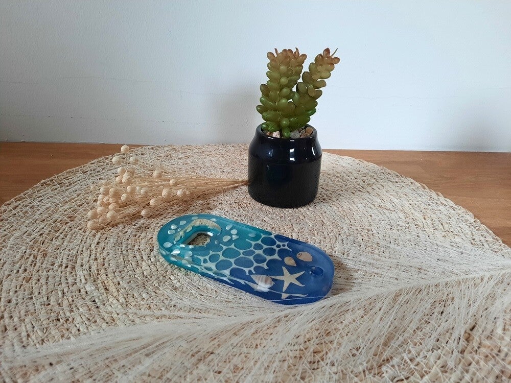 Deze epoxy flessenopener is meer dan een praktisch item; het is een kunstwerk dat een stukje oceaan naar je interieur brengt.