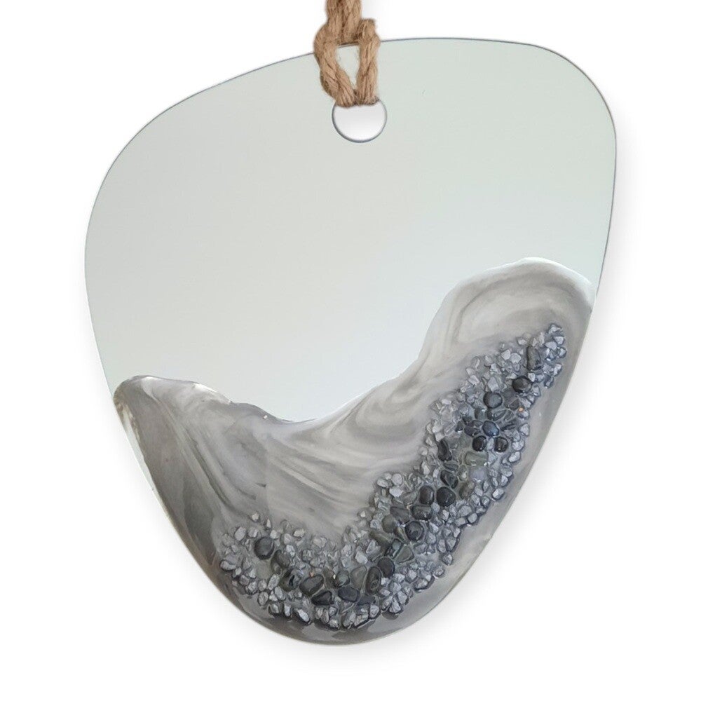 Unieke Ovale Driehoekspiegel – Handgemaakt in Grijs en Zwart met Epoxy en Glassteentjes