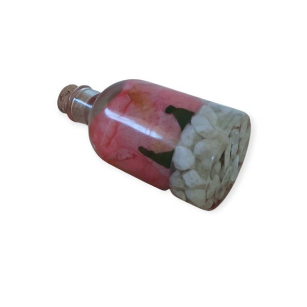 Breng verfijning en unieke schoonheid in je interieur met deze met zorg handgemaakte epoxy fles. De zalmroze roos van zijde, gevangen in helder epoxy, straalt tijdloze elegantie uit. Op de bodem liggen subtiele witte steentjes die zorgen voor een serene en luxe uitstraling.
