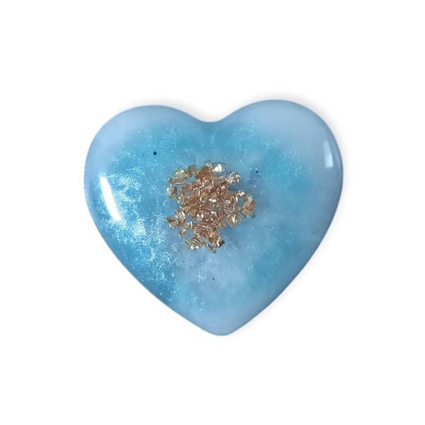 Geef een liefdevol en betekenisvol geschenk met dit handgemaakte epoxy hartje, verkrijgbaar in de varianten Knuffelhart en Gelukshart. De witte en lichtturkooizen basis, gecombineerd met goudkleurige glassteentjes in het midden, zorgt voor een elegante en warme uitstraling.
