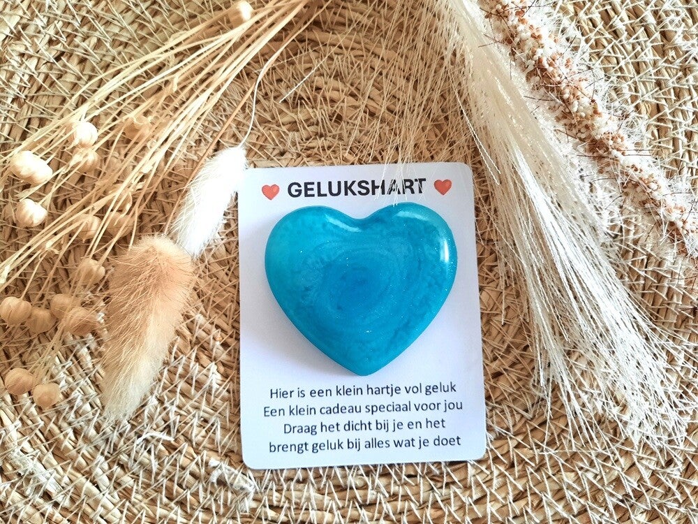 Geef een liefdevol en betekenisvol geschenk met dit handgemaakte epoxy hartje, verkrijgbaar als Knuffelhart of Gelukshart. De heldere transparante basis, gecombineerd met een betoverende aqua-blauwe swirl, zorgt voor een frisse en elegante uitstraling die prachtig speelt met het licht.