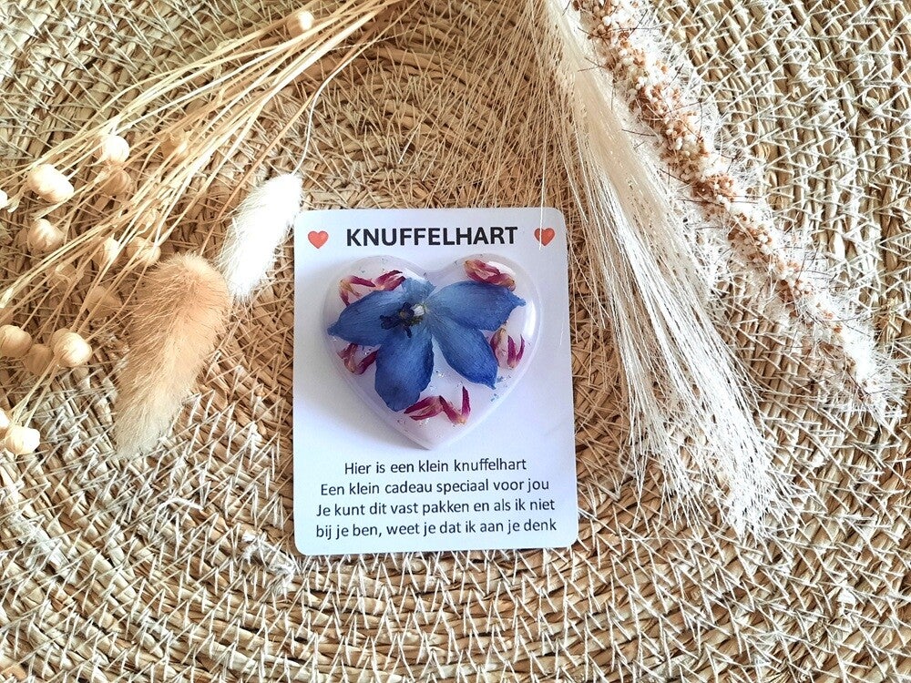 Geef een liefdevol en betekenisvol geschenk met dit handgemaakte epoxy hartje, verkrijgbaar als Knuffelhart of Gelukshart. De witte basis, verrijkt met blauwe en roze droogbloemen, zorgt voor een elegante en harmonieuze uitstraling.