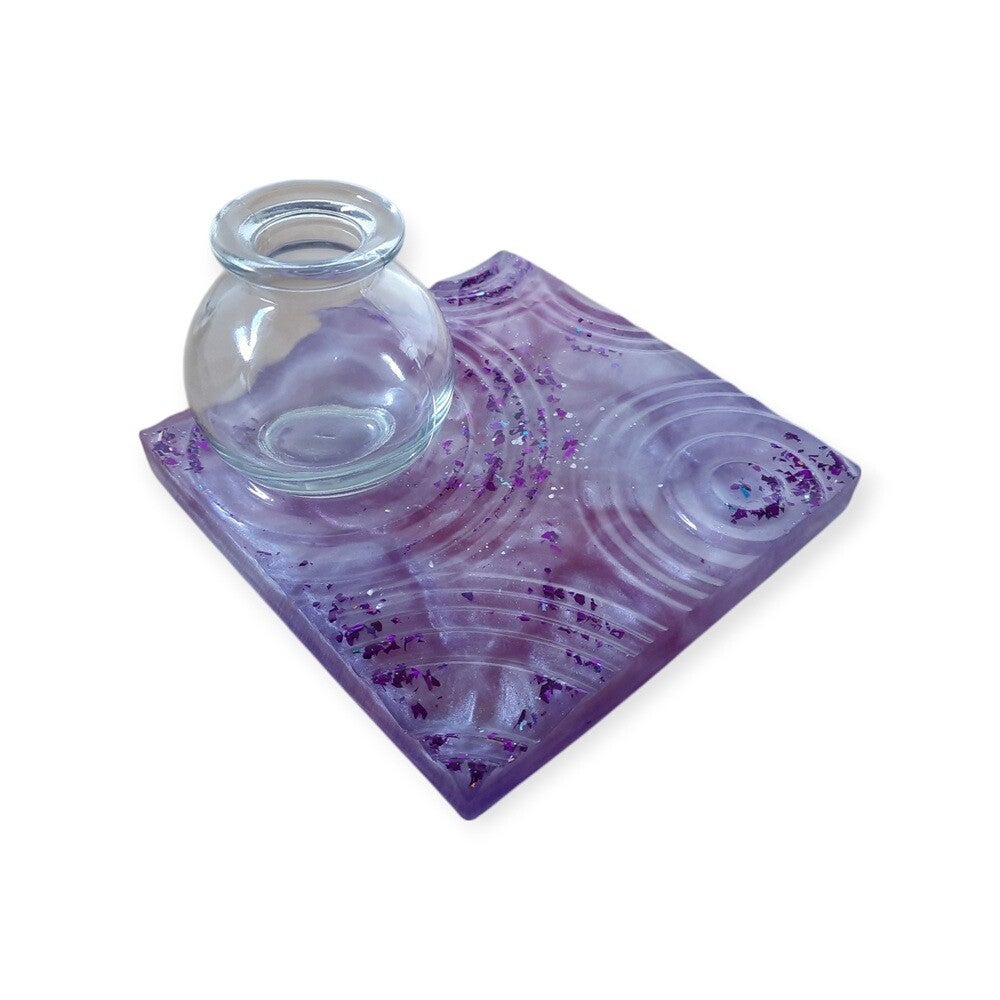 Epoxy plateau met waterrimpeling lila en roze met glitters en glazen vaasje