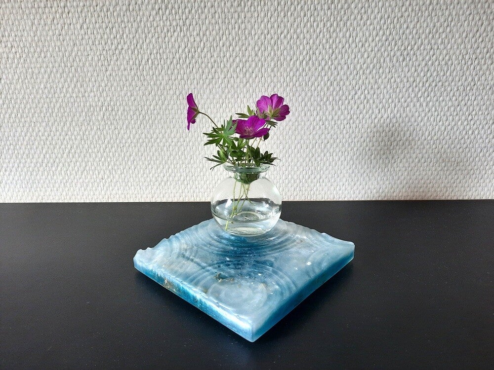 Epoxy plateau met waterrimpeling aquablauw met goudfolie vlokken en glazen vaasje