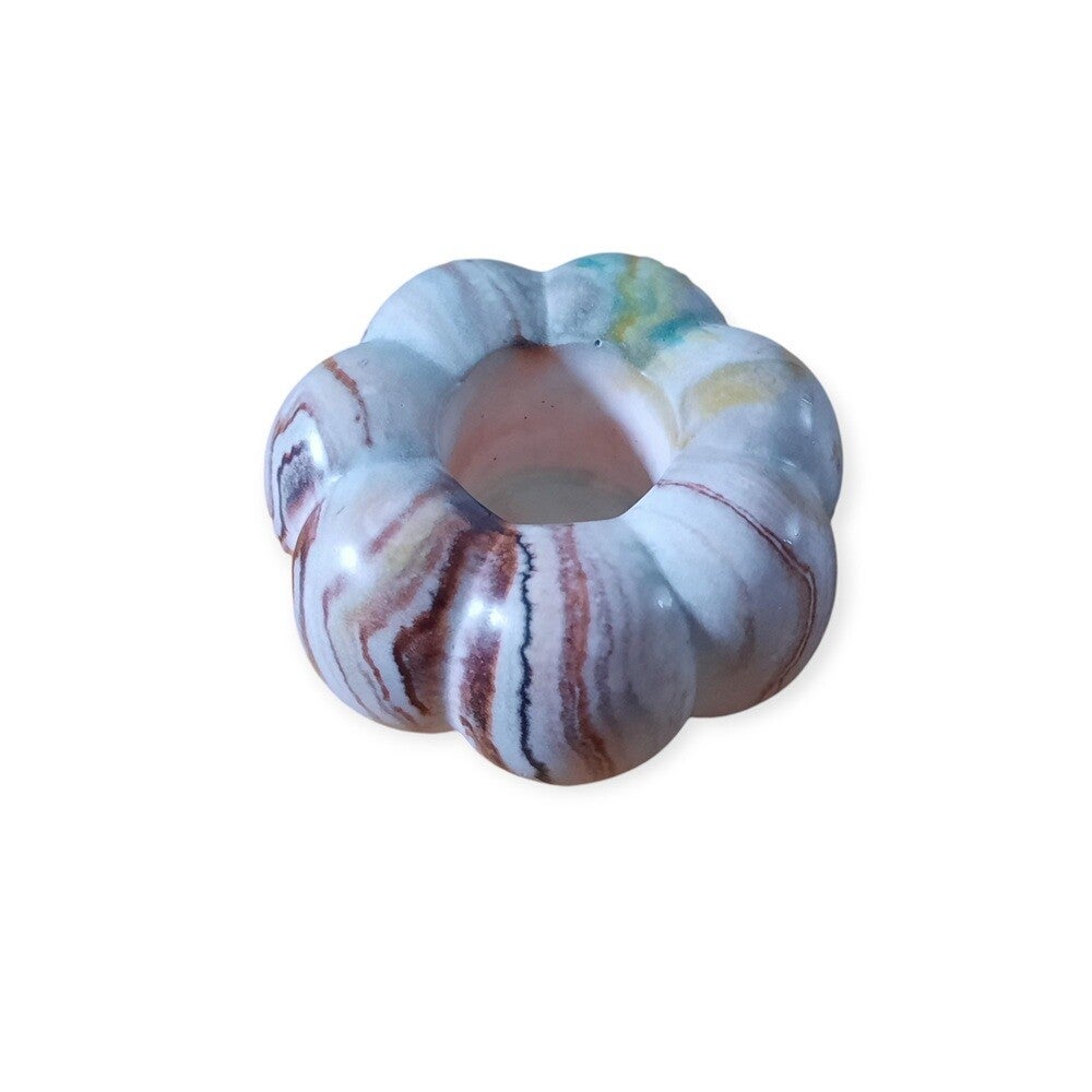 Een subtiele mix van natuur, ambacht en elegantie—deze handgemaakte kaarsenstandaard in pompoenvorm is een uniek woonaccessoire dat rust en karakter brengt in huis. Gemaakt van Aquacast en afgewerkt met een natuurlijk marmerpatroon in crème, groen en bruin. Het resultaat is een stijlvol object dat warmte uitstraalt en perfect past in een sfeervol interieur.