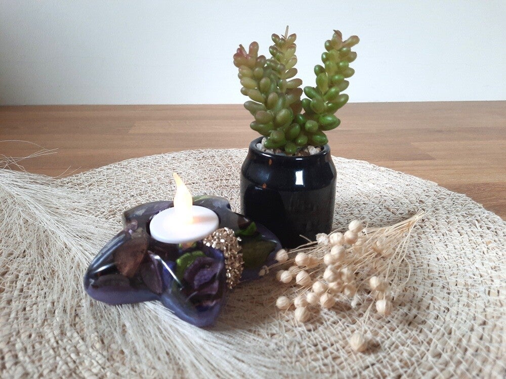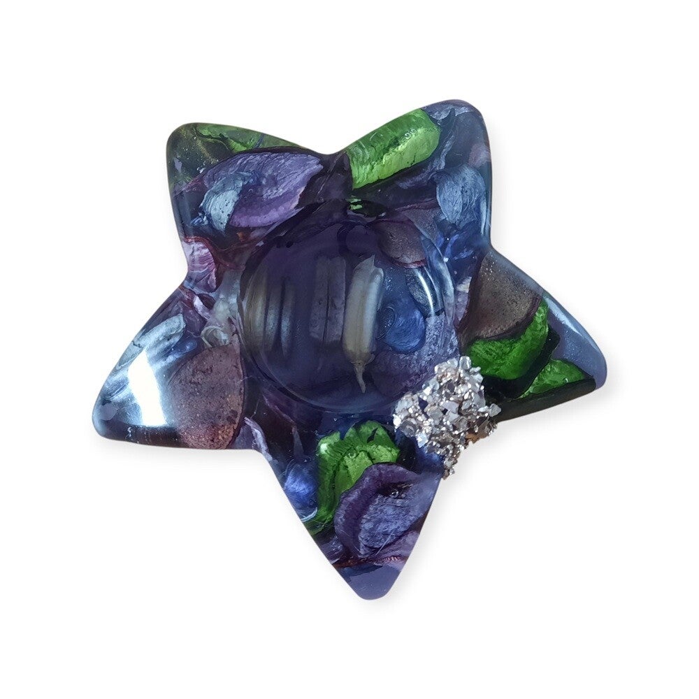 Een ster die warmte, geur en glans samenbrengt. Deze handgemaakte waxinelichthouder in stervorm is een uniek woonaccessoire waarin potpourri is verwerkt. De paarse epoxybodem geeft een stijlvolle basis, terwijl op één plek glassteentjes zijn aangebracht — zorgvuldig vastgezet en afgewerkt met een beschermende blanke lak. Een subtiel sprankelend accent dat het geheel laat stralen.