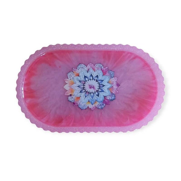 Epoxy Plateau met Mandala – Roze met wit marmerpatroon