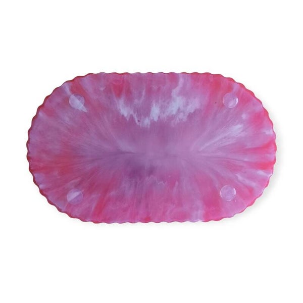 Laat je interieur stralen met dit handgemaakte epoxy plateau, een waar kunstwerk vol kleur, energie en verfijning. Het ovale plateau heeft sierlijke, golvende randen die subtiel glinsteren, waardoor het geheel een luxe en speelse uitstraling krijgt. De roze‑witte marmerlook vormt een zachte, dromerige basis voor de prachtige mandala in het midden — een explosie van blauw, paars, roze, geel en wit in een harmonieus, symmetrisch patroon.